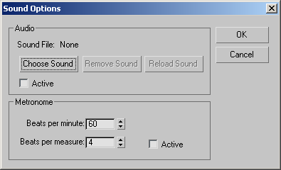 When using the Default Sound plug-in, the Sound track in the Track View Controller window provides two sound options: You can use the metronome to generate a series of beeps, or load a sound file to play back.
