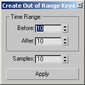 Create Out of Range Keys creates keys in the out-of-range time of a track when the out of range type is something other than Constant. It converts the specified out-of-range area to a keyed area that you can edit and adjust.