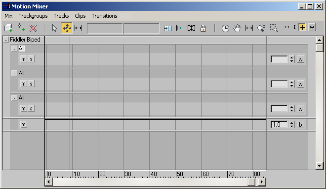 When a trackgroup is created, it is given one Layer track by default. However, you can add more tracks to each trackgroup, making it possible to mix motions for each set of body parts. For example, you could create a trackgroup for the arms, and have two tracks within this trackgroup. Then you could put two completely different sets of motions on each track, and use weighting to use one track or the other at different times during the motion. See Adjusting Track Weight.