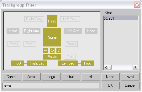 3ds Max opens the Trackgroup Filter dialog. By default, all body parts are selected.
