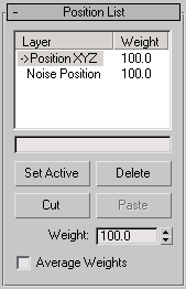 For example, you have an object using a Position List, with Noise Position and Bezier Position in the list. The Bezier Position controller handles the general motion path of the object, while the Noise Position controller adds a random shake to the motion.