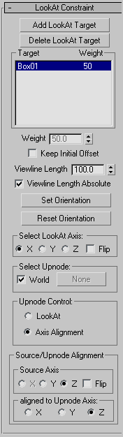 The LookAt constraint parameters are located under the LookAt Constraint rollout.