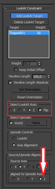 Use to define the axis that looks at the target. The X,Y,Z checkboxes reflect the constrained object's local coordinate system. The Flip checkbox reverses the directions of the local axes.