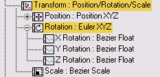 The Euler XYZ Rotation controller is a compound controller that combines separate, single-value float controllers to specify an angle of rotation about each of the X, Y, and Z axes. Euler XYZ is not as smooth as quaternion rotation (used by the TCB Rotation controller), but it is the only rotation type that you can use to edit rotation function curves.