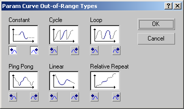 The Parameter Curve Out-of-Range Types dialog gives you four ways to repeat animation and two ways to apply linear values.