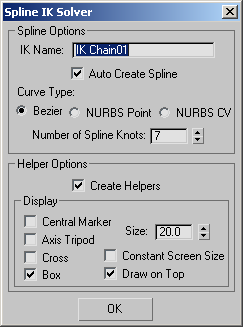 - Automatically creates the spline used for the Spline IK solver based on the parameters on this dialog. When off, no spline is created and a spline must be manually created and assigned to the spline IK solver in order to use the solver. See Spline IK for a description of this procedure. Default=on.