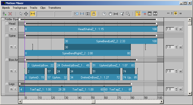 The Motion Mixer works in a similar way. For any object, you can add multiple tracks to the mixer, each holding a separate series of motion clips (BIP files or XAF files). You can trim clips to use only part of a motion, make the clips play slower or faster, or create transitions from one clip or set of clips to another.