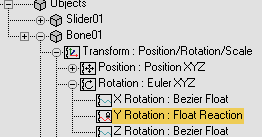 Reaction controllers come in five different types: Position Reaction, Rotation Reaction, Point3 Reaction, Scale Reaction, and Float Reaction. You can assign a Reaction controller to any animatable track in the scene. Reaction is not based on time, but rather on other variables in your scene such as position or rotation.
