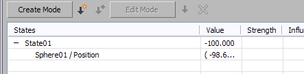 This is an example of the basis of the control mechanism used by the Reaction controller: For each master/slave combination, you can specify any number of states defined by values for the master and slave tracks. The first state, created automatically when you added the master, specifies that when the box is at –100 on the X axis, the sphere should be at (–100,0,50). In this case, you're controlling three parameters (the sphere position on all three axes) with one (the box position on the X axis). More typically you'd use one-to-one master/slave-parameter ratios.