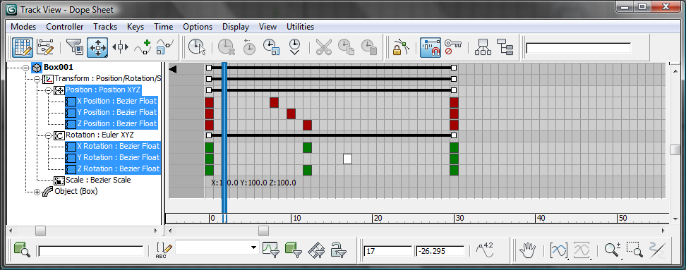 The Dope Sheet editor uses Track View to display animation keys over time on a horizontal graph. This graphical display simplifies the process of adjusting animation timing because you can see all keys at once in a spreadsheet-like format. The alternative Track View mode is Curve Editor, which lets you work with interpolation curves in addition to keys.