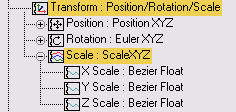 The Scale XYZ controller has independent float controllers for each scale axis of an object's transform. With three separate tracks for scale, you can create scale keys for each axis independently, change interpolation settings for a single axis, or assign a controller on an axis. For example, after applying a Scale XYZ controller, you could apply a Noise or Waveform controller to an axis to animate that axis independently.