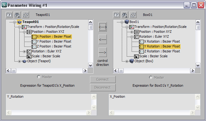 In Track View, the animation subcontroller appears as a nested track inside the master parameter’s track. Its values directly drive and match the master parameter values. If the subcontroller is keyframable (which is the default when a two-way wiring is first established), you can keyframe it by adjusting either of the wired parameters. This means that if you keyframe the wired pair by adjusting the non-master parameter, the values keyframed into the animation subcontroller are derived from the master parameter transfer expression. Since the wired pair can be animated through either parameter, the choice of master parameter is essentially just a convention.