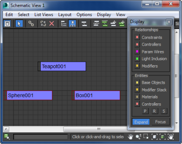 If parameters are wired within a scene node, such as an object's position to a parameter of a modifier applied to the object, the wiring might not be readily apparent in Schematic View. However, you can use additional Display options to expose the wiring.