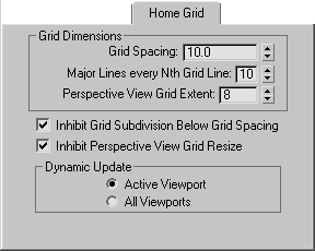The Home Grid panel of the Grid And Snap Settings dialog sets the spacing and other characteristics of the home grid. Choosing useful home grid settings can simplify the construction process. The home grid provides a visual reference for creating objects in a scene.