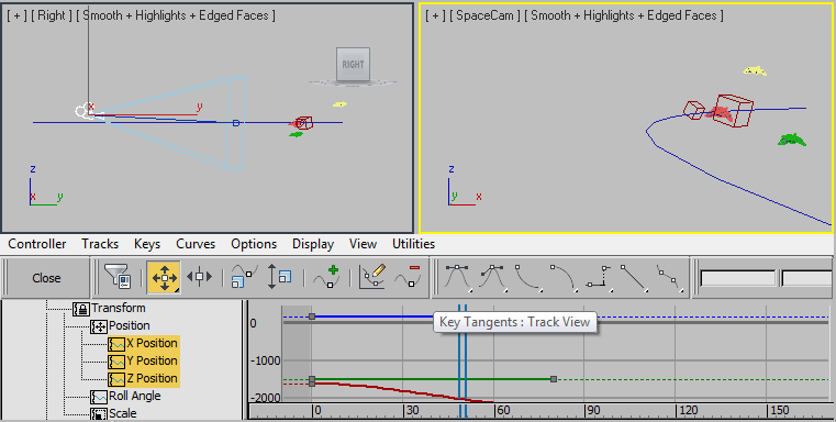 (Open Mini Curve Editor) at the left end of the track bar. The time slider and track bar are replaced with the controller and key windows and the Track View toolbars. You can resize the track bar window by dragging the border between the menu bar and the toolbars (do this in an empty toolbar area).
