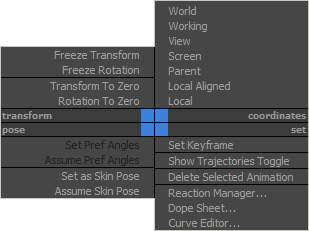 Commands in this quadrant are meant primarily as aids to character animation. Use the Freeze commands to set the character's initial pose. Then you can later use the “to Zero” options to return to that initial pose.