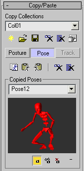 The Copy/Paste rollout on the Motion panel provides controls to help you copy and paste biped postures, poses, and tracks. A posture is the rotation and position of any selection of biped objects. A pose is the rotation and position of all the objects in a particular biped. A track is the animation for any selection of biped parts. For information on working with tracks, see Copying and Pasting Tracks.