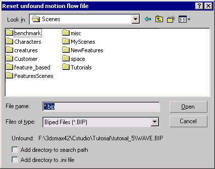 - From the Reset Unfound Motion Flow Files dialog, direct 3ds Max to the folder where the missing BIP file resides.