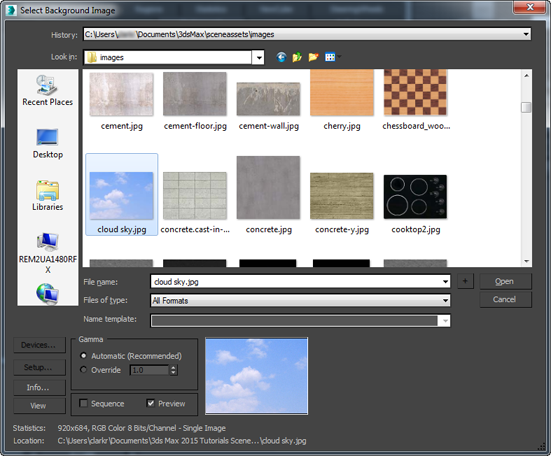 The Select Background Image dialog allows you to choose a file or sequence of files for a viewport background.