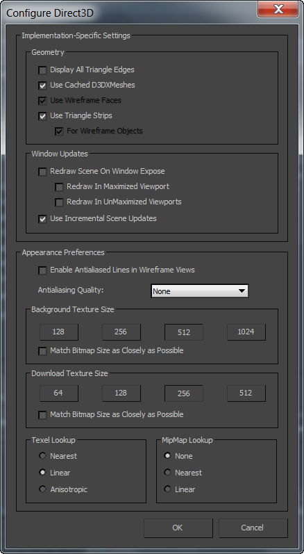 64, 128, 256, 512 Lets you choose the size of the texture map that's downloaded to the driver for texture-mapped scene objects. Larger maps look better, but use more display card memory. Default=256.