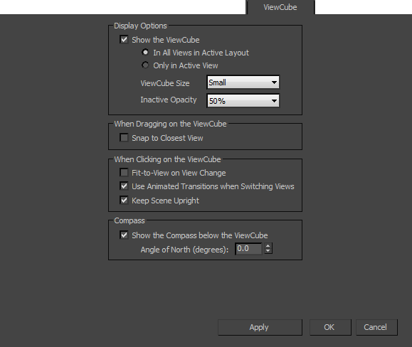 These controls affect interaction with the ViewCube feature. Any changes in settings persist between sessions.