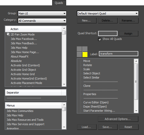 - Displays the names of all 3ds Max menus. To add a menu to a specific quad set, select it and drag it to the quad menu window on the right side of this dialog. Right-click a menu in this window to delete the menu, rename it, or create a new, empty menu.