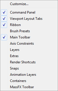 The Customize Display right-click menu displays when you right-click over a blank area of a toolbar (not when the cursor is over a button) or certain parts of the command panel. Use this menu to toggle the display of various user-interface elements, customize the display of toolbars, and dock or float items such as the command panel.