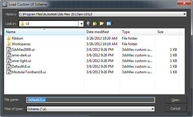 Use the Load Custom UI Scheme dialog to specify the base file name of the custom UI scheme to load. Choose any type of UI scheme file from the dialog, and 3ds Max will load any other type of UI scheme files with the same base file name.