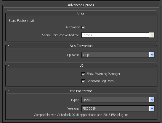 | FBX 2015 | Select this FBX version to export a file that is compatible with Autodesk 2015 applications and 2015 FBX plug-ins. This is the default FBX version. |