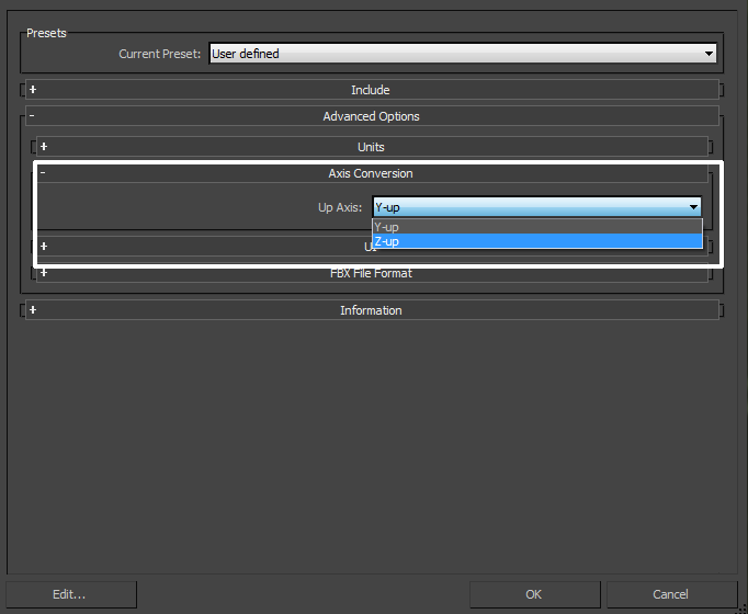 When you use the Autodesk Media & Entertainment preset, the 3ds Max FBX plug-in exports using the Y-Up Axis.