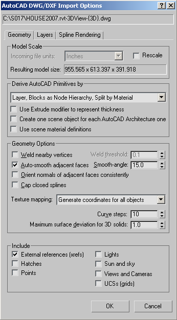 For example, if a drawing file is built in millimeters and 3ds Max has its System Units set to inches, the AutoCAD DWG/DXF Import Options dialog automatically has Rescale on and the Incoming File Units set to millimeters.