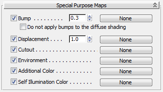 Many material rollouts have shortcut buttons for assigning a map to some of the material's visual components. These small buttons are equivalent to the buttons on the Maps rollout. Assigning a map to a button in one rollout changes the corresponding button in the other. There are similar controls for material types that don't include explicit Maps rollouts.