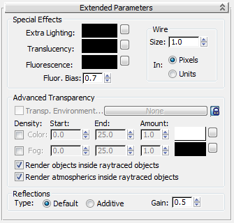 Except for the wireframe controls, the controls in the Extended Parameters rollout for Raytrace material are specific to the Raytrace material.