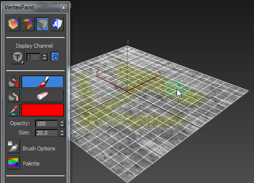 Modify panel, apply a VertexPaint modifier to the Plane. 3ds Max opens the VertexPaint Paintbox.