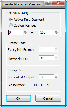 The Create Material Preview dialog is displayed when you click Make Preview to preview an animated material. By default, the preview is saved in the \previews subdirectory with the name _medit.avi. You can use Save Preview to give the preview a different name so it won't be overwritten the next time you use Make Preview.