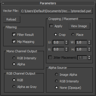 Some parameters, such as opacity or specular level, are a single value as opposed to a material's three-value color components. Controls in this group determine the source of the Output mono channel in terms of the input vector file.
