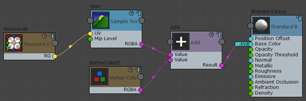 Vertex Color 0 node (drag and drop from the Node Browser to the work area) and connect it to the Base Color attribute of your Standard Base node.