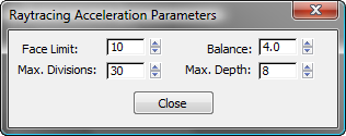 The controls on this dialog let you override the default acceleration values and specify your own requirements. Typically you don't need to use them, but if you are familiar with the requirements of your scene, they can help you optimize raytrace rendering for your specific needs and time constraints.