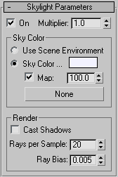 [map controls] These let you use a map to affect Skylight color. The button assigns a map, the toggle sets whether the map is active, and the spinner sets the percentage of the map to use (when the value is less than 100%, map colors are mixed with the Sky Color).
