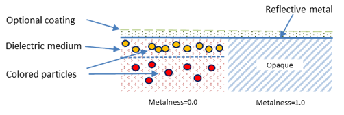 - a base layer that is either a diffuse color with a Fresnel-driven dielectric relection, or colored metallic reflections