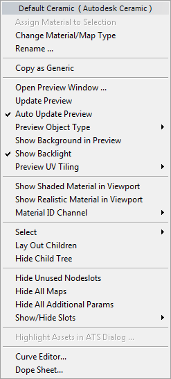 Right-clicking a material or map node displays a menu that has a variety of options for displaying and managing the material or map.