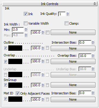 There are map controls for each of the ink components: Width, Outline, Overlap, Underlap, SmGroup, and Mat ID. These work the same as they do for the material's paint components, as described preceding.