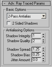 1-Pass Antialias Casts a bundle of rays. The same number of rays is cast from each illuminated surface. The number of rays is set using the Shadow Integrity spinner.
