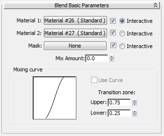 The Blend material lets you mix two materials on a single side of the surface. Blend has an animatable Mix Amount parameter that lets you draw material morphing function curves to control the way that the two materials are blended over time.