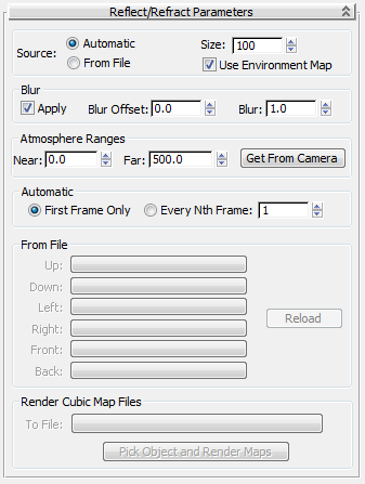 When From File is active, the controls in the Render Cubic Map Files group are also available. You can generate the six cubic reflection maps automatically and save them to files, where you can load them with the From Files controls.