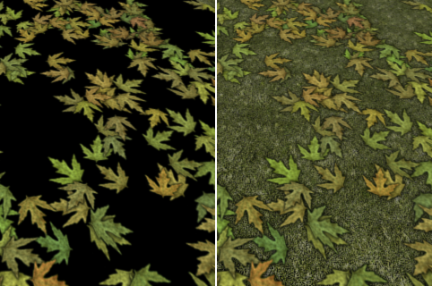Right: Autumn Leaves with Opacity output applied to material Opacity map input, showing underlying Substance map (Lawn)