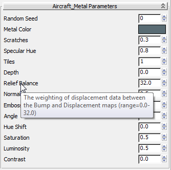 When using the Bump and Displacement outputs separately, specify the balance between the two with the Relief Balance setting available on the Substance map’s Parameters rollout. The available Relief Balance value range is 0.0 to 32.0, with the latter being the default. Higher Relief Balance values favor the Bump output, while lower values place greater emphasis on the Displacement output.