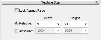 These settings affect the output resolution of the current texture only. You can base the resolution of the current texture on the global size (Relative) or set it independent of the global size. Use this rollout to choose either option and set the dimensions of the current individual Substance. Higher Texture Size settings produce better-looking textures, but take longer to render.