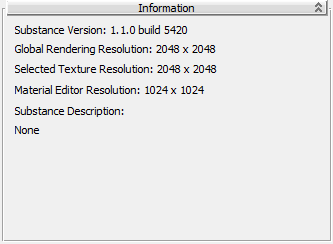 This read-only rollout displays the current version of the Substance software, resolution settings, and the description of the current package, if supplied by the author.
