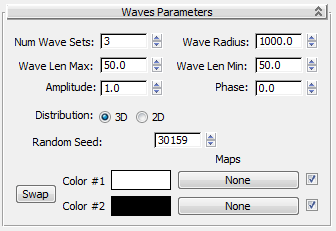 Specifies how many wave sets are used in the pattern. Wave sets are groups of radially symmetrical waves that originate from randomly computed points along the surface of an imaginary sphere inside the object (a circle, in the case of 2D wave distribution). For calm water, set this to a low number. Use a high number for choppy water. Range= 1 to 50; Default=10.
